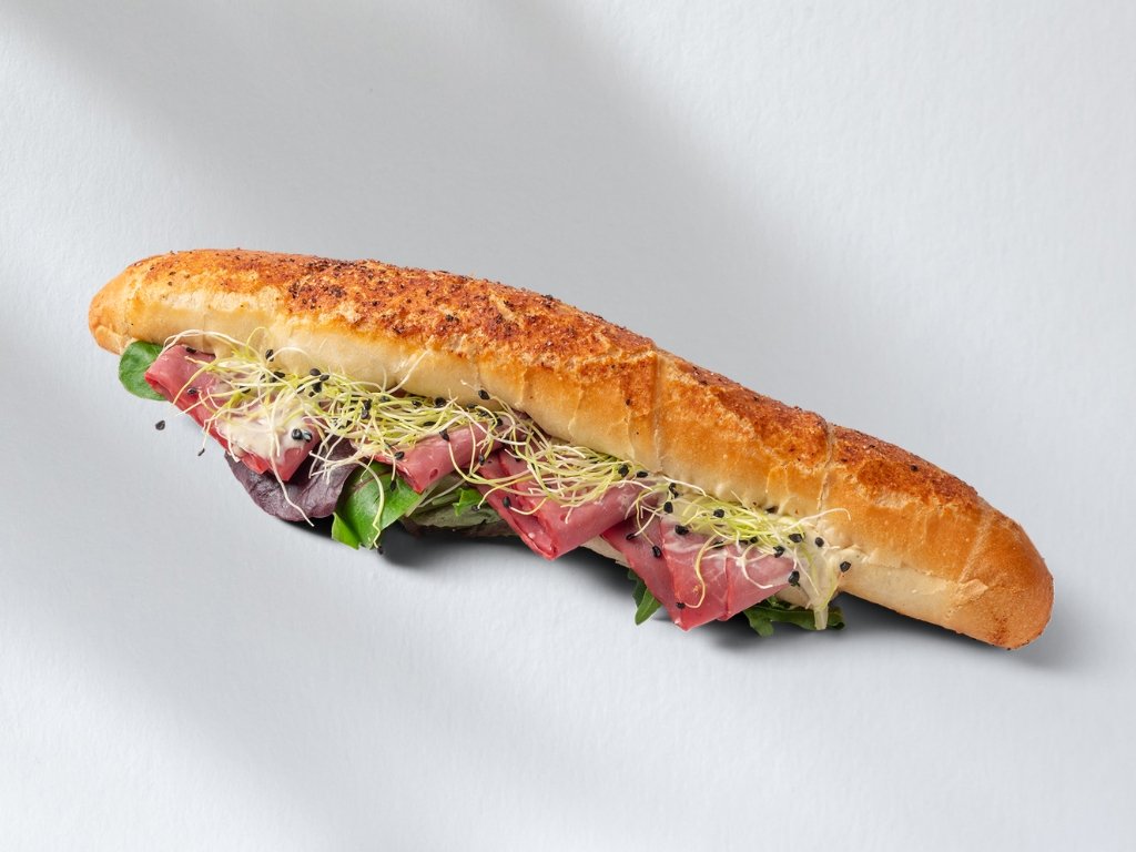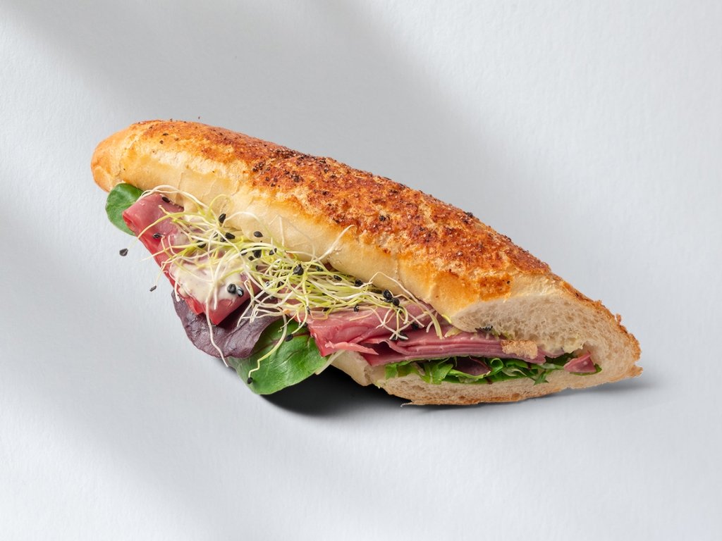 Peprný rohlík připravujeme z nadýchaného pečiva s jemně pikantní chutí. Uvnitř najdete svěží listový salát, poctivou hovězí šunku, medovohořčičný dresink a klíčky česneku, které dodávají rohlíku výraznou a vyváženou chuť. Skvěle se hodí jako rychlá slaná svačina nebo lehký oběd.